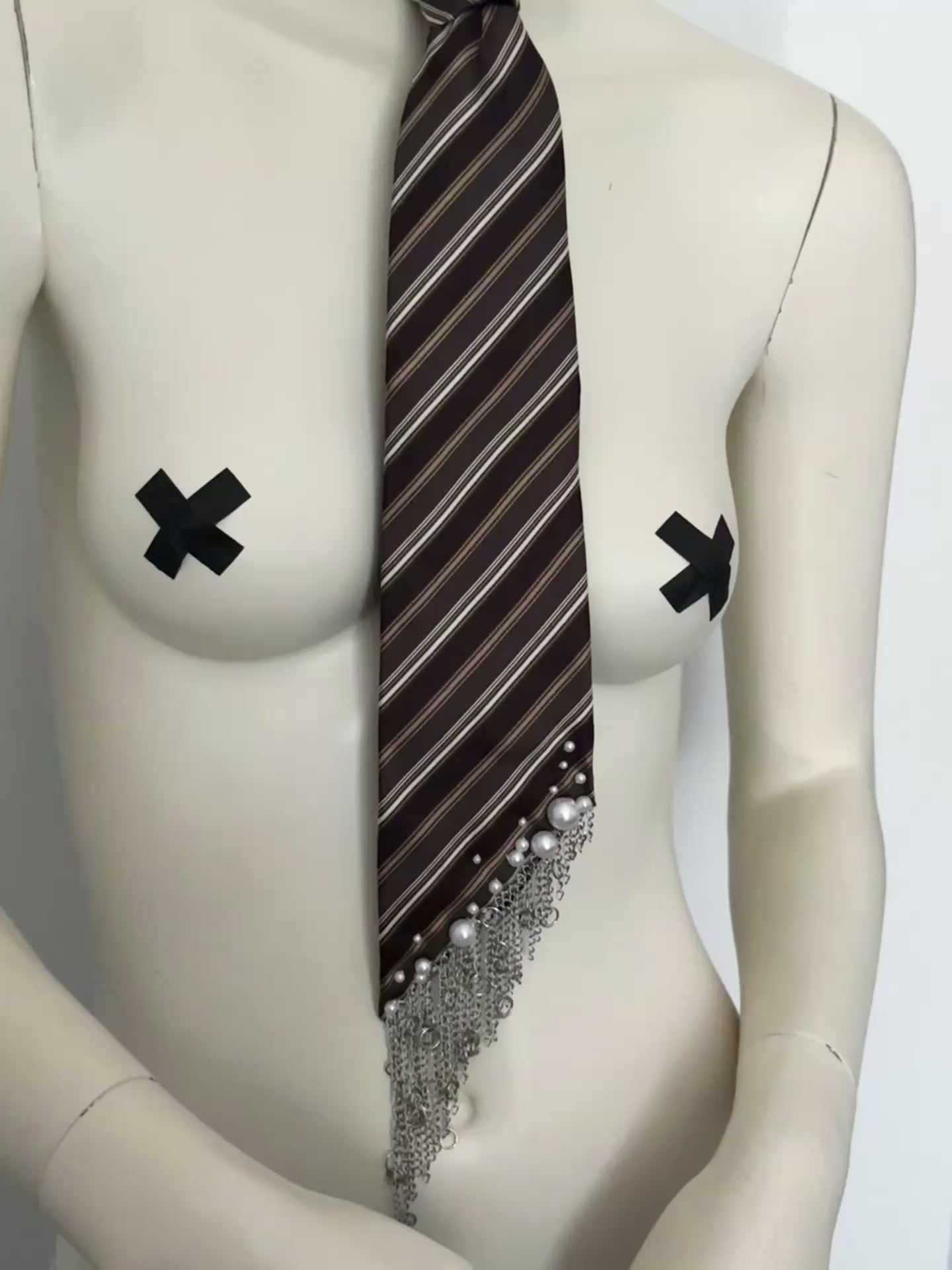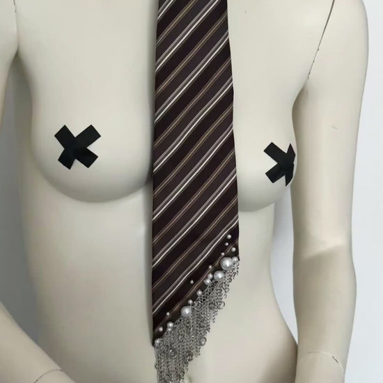 Cut in half, rebuilt with chains, and detailed with pearls, it blends sharp tailoring and rebellious luxury. Brown hues meet handcrafted detail for a custom piece that commands attention.