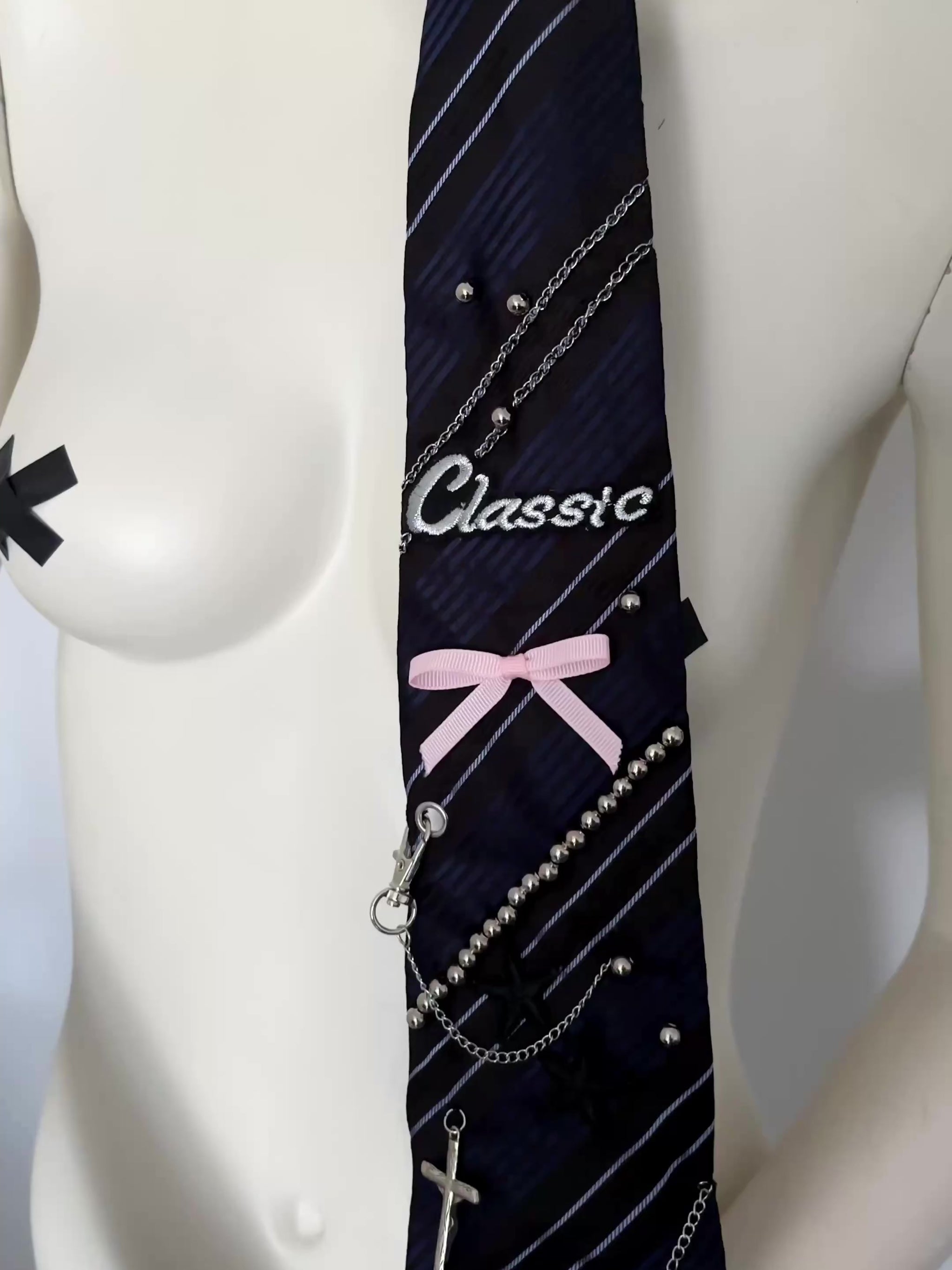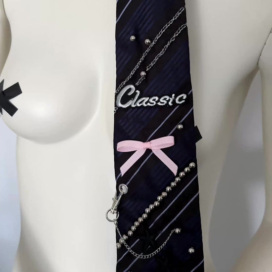 Not your typical men’s tie: upcycled and handmade with patches, a bow detail, silver pearls, and chains. Effortlessly add an edgy, creative, and unique accessory to any outfit. Perfect for fashion-forward, statement-making looks.