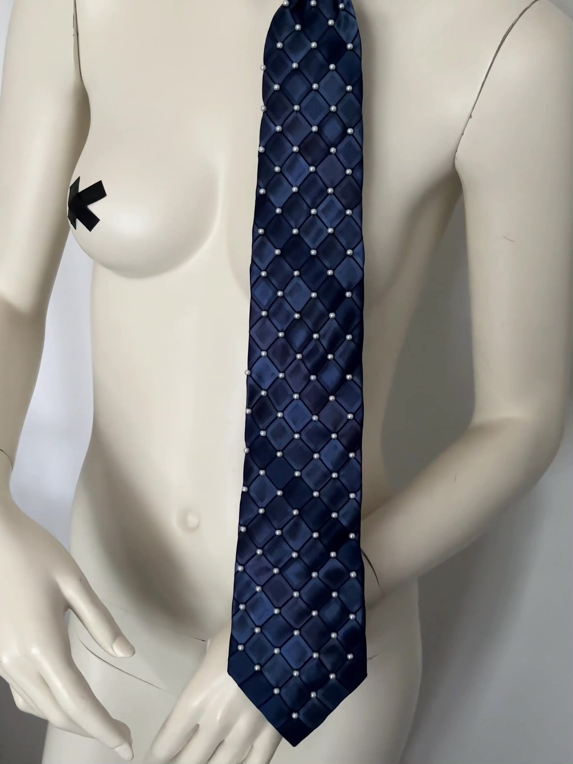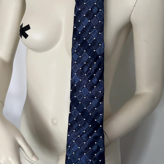 Royal blue upcycled tie with perfectly symmetric hand-stitched pearls — timeless elegance redefined.